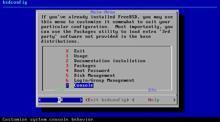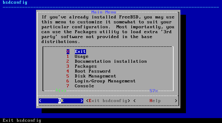 選択が終わったら、「X Exit」を選択してbsdconfigのメニューを終了します。