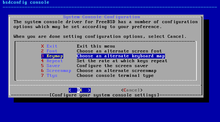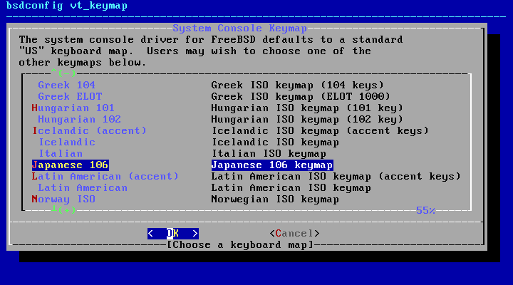 bsdconfigコマンドで、キーマップの設定を行います。